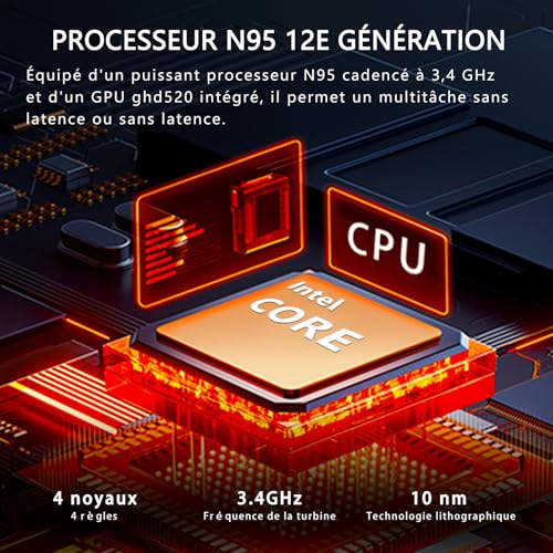 ntel Celeron N95 – Der Intel Celeron N95-Prozessor der 12. Generation hat eine Spitzenfrequenz von bis zu 3,4 GHz. Als Vierkern- und Vier-Ablaufstrang-Prozessor wird er mit dem fortschrittlichen 10-nm-Vorgehen hergestellt und integriert auch den Intel UHD520-Grafikprozessor. Die GPU-Leistung hat sich um 78 % deutlich erhöht. Er kann mehrere Aufgaben gleichzeitig problemlos bewältigen. Selbst wenn mehrere Programme wie Büroarbeit und Design gleichzeitig laufen, gibt es keine Verzögerung