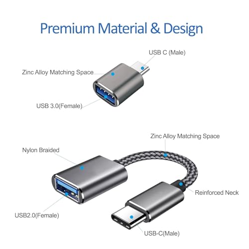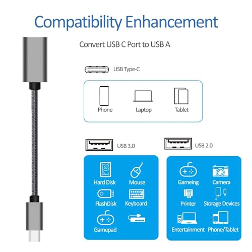 【 OTG USB Anpassungseinrichtung Modifizieren Sie USB-A-Geräte 】 Verwenden Sie diesen USBC Anpassungseinrichtung, um jedes USB-A-Peripheriegerät (Flash-Laufwerke, Tastaturen, Maus, Festplatte, Game-Controller, USB-Lüfter…) anzuschließen, das Sie mit Ihren neuen USB-C-fähigen Geräten zur Hand haben. Der verstärkte USB-Typ-C-Anschluss verfügt über ein symmetrisches Design, wodurch er beim ersten Versuch einfach angeschlossen werden kann.